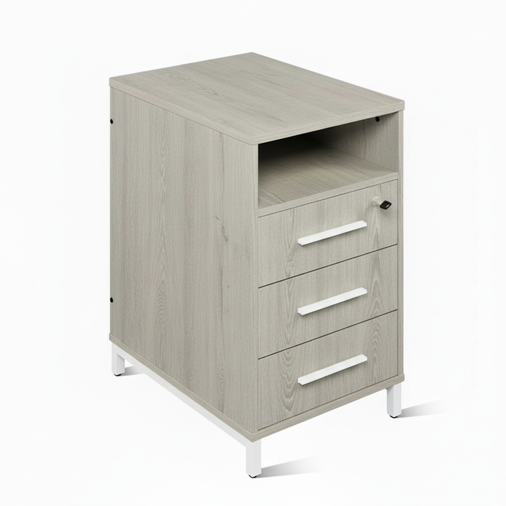 Каркас тумбы изготовлены из ЛДСП толщиной 16 мм. Крышка тумбы изготовлена из ЛДСП толщиной 22 мм. Все элементы изделия облицованы ударопрочной кромкой ПВХ 0,4 и 2 мм. Дно ящиков – ДВПО толщиной 3 мм. Тумба оснащена нишей высотой 144 мм, ящиками – 150 мм – 3 шт. Детали тумбы соединены между собой эксцентриковыми стяжками, евровинтами и винтами. Для плавного выдвижения ящиков применены роликовые направляющие. На фасады ящиков устанавливаются металлические ручки 160 мм. Верхний ящик оснащен замком. Тумба устанавливается на металлическую опору высотой 90 мм. Опора тумбы изготовлена из стального профиля 25х25 мм и 20х20 мм с толщиной стенки 1,2 мм. На опорах установлены пластиковые заглушки с регулируемыми подпятниками М8. Все металлические части покрыты полимерно-порошковой краской. Использование тумбы возможно со столами эргономичными, а также с другими изделиями серии «Лофт». Для изготовления тумбы используется ЛДСП высококачественного класса эмиссии Е1 и качественные комплектующие российских и зарубежных производителей.